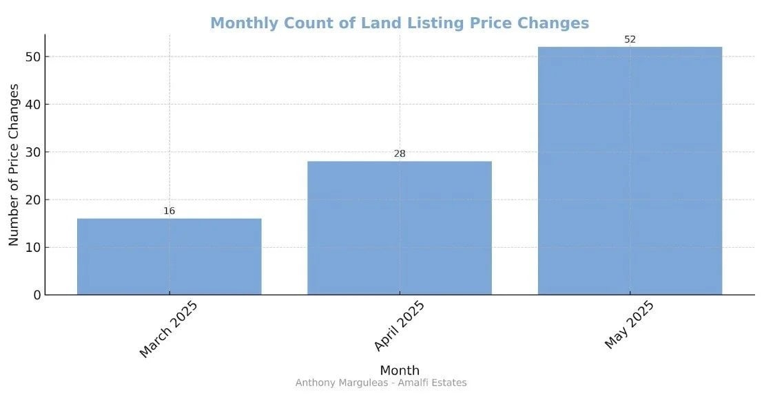 Below is the increase in Land price reductions, indicating that sellers are pricing their properties too high. This reveals a disconnect between sellers and buyers. Many sellers incorrectly choose their asking price by comparing other active listings and hoping to achieve that aspirational price, but sold prices are the only accurate barometer of value.