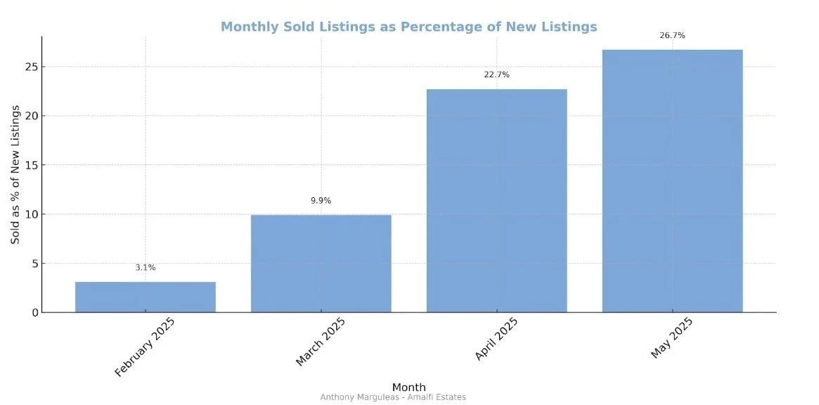 This chart illustrates the narrowing gap in monthly sold listings as a percentage of new listings. It will be interesting to see what the next few months bring. We will need to see at least a 50% absorption rate.